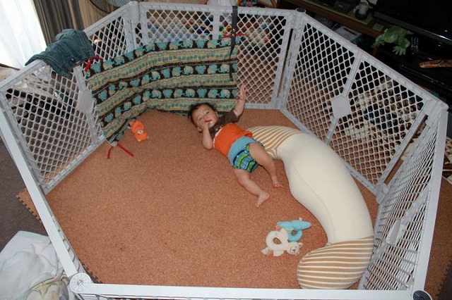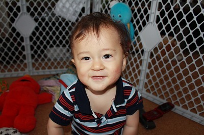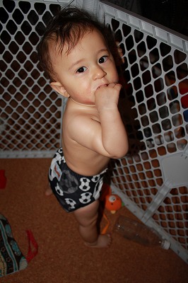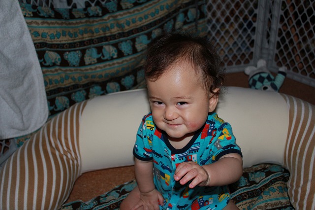 本当はちょくちょく更新したいんだけど、一度書き始めたら長文になってしまう傾向のある私なので、しばらくこのブログも放置してたんだけど、少しずつ小刻みにアップして行こうと思います。 この11日に8ヶ月になった豊吉。お座りで一人遊びできるようになったし、表情も豊かになり、非常におしゃべり!! ひざをついてのハイハイはまだだけど、ズリズリと足と腕を使って移動する手段を身につけました。 今後は今までのように寝てくれてるだけではないので、野放しにも出来ません。 という事で、豊吉 ↓ ↓ ↓ ↓ 独房生活開始です。 そして、先日8ヶ月記念の写真を撮ろうと何度もシャッターを押してたら、気になる一枚が!! まだ0歳児。社会の汚れた部分さえ見えずピュアな心を持ってるはずなのに・・・・・ お主も悪よのう・・・ ヒェェ~!!! こんな表情を誰から教わったんだ!? ま、オモシロいからいいけど。 |