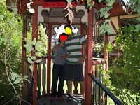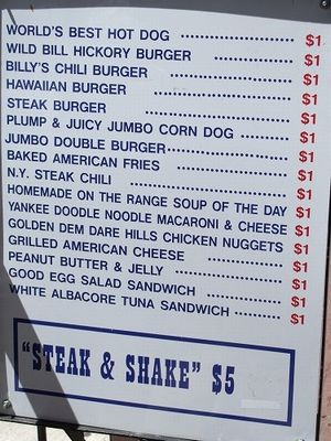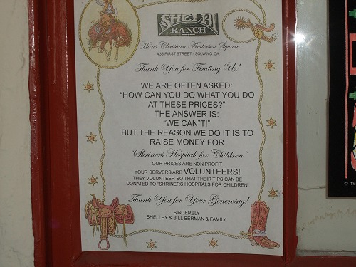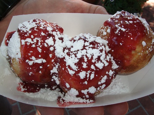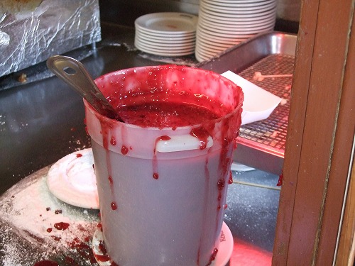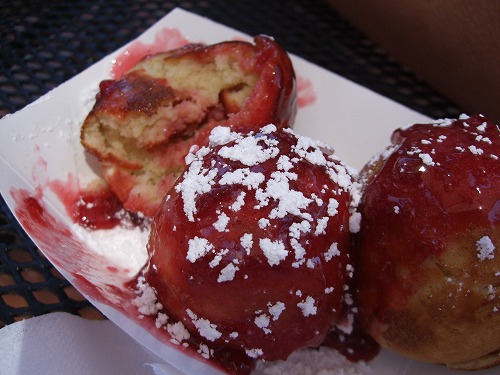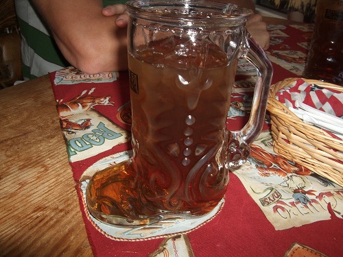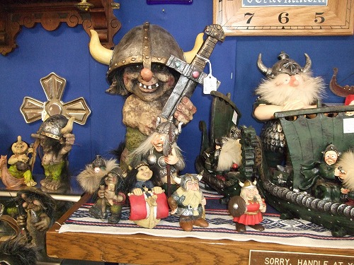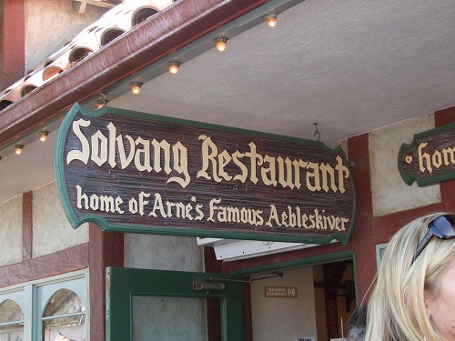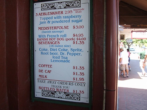 SOLVANGの旅の始まり~ 【8月9日】その1 デンマークの街、DOLVANGを歩く【8月9日】その2 SOLVANGのラヴェンダー畑、ポニー農場、フィエスタ【8月10日】その1 この続き~。ランチをどこで食べるか、4人でいろんなところを捜し歩きました。 (写真はクリックすると別ウィンドウで拡大して見られます♪) 何だかおもちゃ箱の世界に入り込んだ感じになってしまいましたが、この建物の中で細々と商売をやっている人もいて、小さいながらもお客さんも結構来ている感じ。 途中、ちょっとした何て呼ぶのか分からない空間があり、そこで記念撮影。 そしてこの建物を出てすぐの所に、皆をビックリさせるようなサインが出ていました。 ↓ ↓ ↓ ↓ クリックすると拡大して見られるのですが、この'メニューのスゴさというか、恐ろしさが分かりますでしょうか?? 右側の赤い値段に注目してもらうと分かるのですが、 全て1ドル!! いくらタイムシェアに泊まっているとはいえ、この先もきっと外食が多くなるであろうと予想されるので、こんな格安メニューは信じられないくらいに嬉しいものです。 でも本当にこんなに安いのに、味の方は大丈夫なのかしら??とドキドキしながらも、「ま、1ドルなんだから」という、あの99¢ショップや100円ショップでお金を落としていく感覚と一緒になってくるんですよね ![]() とりあえず、何品かを注文し、店内に入っていくと・・・ これまたいろんなものが大安売り。何だかバザー会場に来ているみたい ![]() これも全部が1ドルなんて事はなく、少しは値段が付いていたのですが、それでも10ドルを超えるようなものは殆どなかったように思います。 この奥にテーブルがあって、席についたんだけど、目に付いたイスがコレ ↓ ↓ ↓ ↓ さすがにこれは1ドルでもなく、売り物でもなかったんだけど、物凄く手の込んだ作業をしているな~と関心。きっと彫刻好きのJ君のおじさん、熊おじさんが見たら感動する事間違いなしなんだろうな~。 注文を待っている間、店内を見回しながら、食べ物の1ドルの謎を説明するものを発見。 別に、古い原材料を使っているとか、格安労働者で経営されているとかいうネガティブな理由ではなくて、ボランティアの一環で基金集めとして行っているみたいなんですね ![]() そんな事に感心しているとやってきたのが1ドルアイスティ~。 正面から見ると一件普通のグラスなんだけど、これを横に向けると・・・ ブーツの形をしていました でもこのグラスってアイスティーなんかよりもビール を注いだほうが美味しいんじゃないかな。だって、この形のグラスを見ると↓ この映画を思い出しちゃうんですよね ![]() さて、アイスティーの後にやってきたのが、ハンバーガー。 1ドル(星条旗込み!!)にしてはしっかりとしたハンバーガー で、味もこんなものかな~と特に感動した記憶はないです![]() J君は似たような感じでチーズバーガー とフレンチフライを注文。フレンチフライは上の写真の奥のほうに見えると思いますが、良い様に言えばシットリとしていて、悪く言えばベッチャリ・・・J君から数本もらって食べましたが、コレはもういらないって感じでした ![]() そしてランチの後、しばらく散歩して部屋に戻るのかと思いきや、Jママに連行されたのが こんなお店。多分デンマークを始め北欧で有名なデザートなんだと思いますが、少し行列が出来ていたのですが、私達もその行列に加わる事に。 ってか、ランチが終わって10分くらいしか経たないのに、即効ここにやってきたJママ・・・・・ ま、旅行中だからいいんですけどね。 ここはレストランという形でお店があるんだけど、その横で、お持ち帰り用のお客さん向けにも販売していて私たちはここから購入です。 奥の方で何か作業をしていますが、何だかたこ焼きを焼いているみたい~ ![]() 最初は白っぽかったものもちゃんと焼けてくるとこんがりや黄色が付いて美味しそう~。 そして焼きあがったらこのとっても美味しそうなソースをかけて また、このソースのこぼれ加減が旨そう~ ![]() そしてパウダーシュガーを振りかけて・・・ 出来上がり~ 中はこんな感じ。 味はというと・・・・・ ソースは抜群に美味しいです♪ ラズベリーソースなんだけどこの酸味がたまらない~!!! で、肝心の生地の方はというと・・・・・非常にプレーンな味です ![]() というか、やっぱりたこ焼きをイメージしてしまっているので、生地自体にも何か味が付いているのかなと期待していたんですよね。 もしこの生地にも少し甘みがあったら、日本人の好むものになっていたかも・・・・(勝手に私の舌を日本代表にしてしまいましたけどね )デザートの後は、このお店の隣にあったスカンディナビアン・ショップへ。 外から見る限りでも、コレこそJ君の行くお店よ~!!! 胸躍らせながお店の中に入って行きました。 うわぁ~!! あるある。ノルウェーを始めとしたスカンディナビアン・グッズ♪♪ そしてヴァイキング姿のトゥロール(TROLL)も!! 特にサッカー